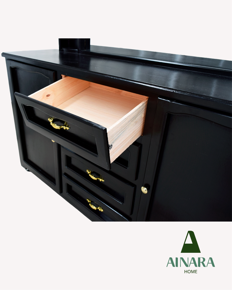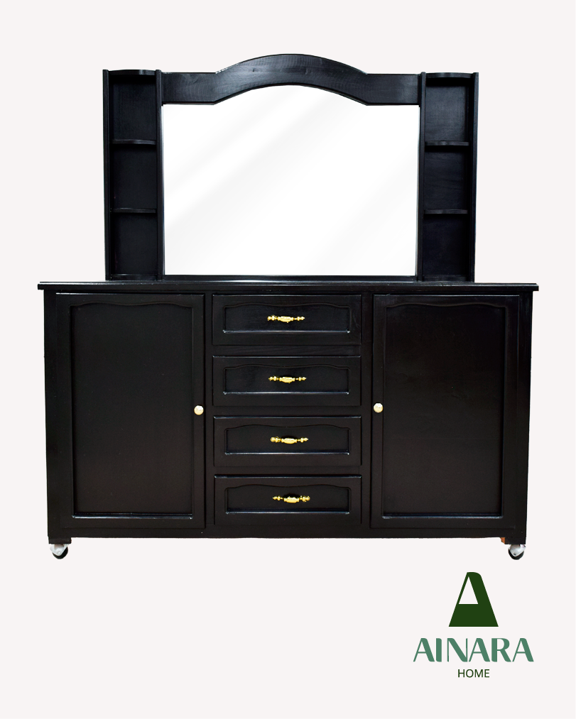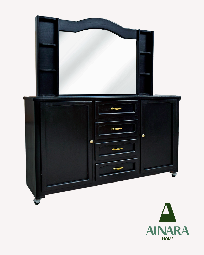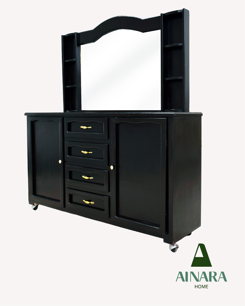 Te presentamos nuestro tocador de dos puertas y 4 cajones con espejo. Ideal para guardar tus accesorios, cosméticos y joyas, mientras el espejo amplio te acompaña al maquillar. Construcción estable y acabado moderno. Perfecto para dormitorios o vestidores en casa.